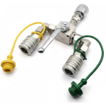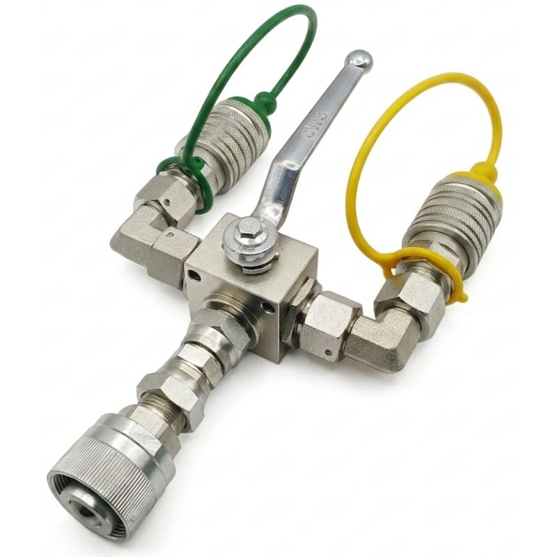 Kompletny rozdzielacz umożliwiający przełączanie pojedynczej linii zasilającej między dwoma liniami wyjściowymi. Komplet z zaworem kulowym i szybkozłączami.