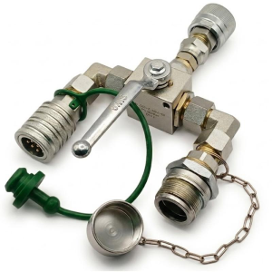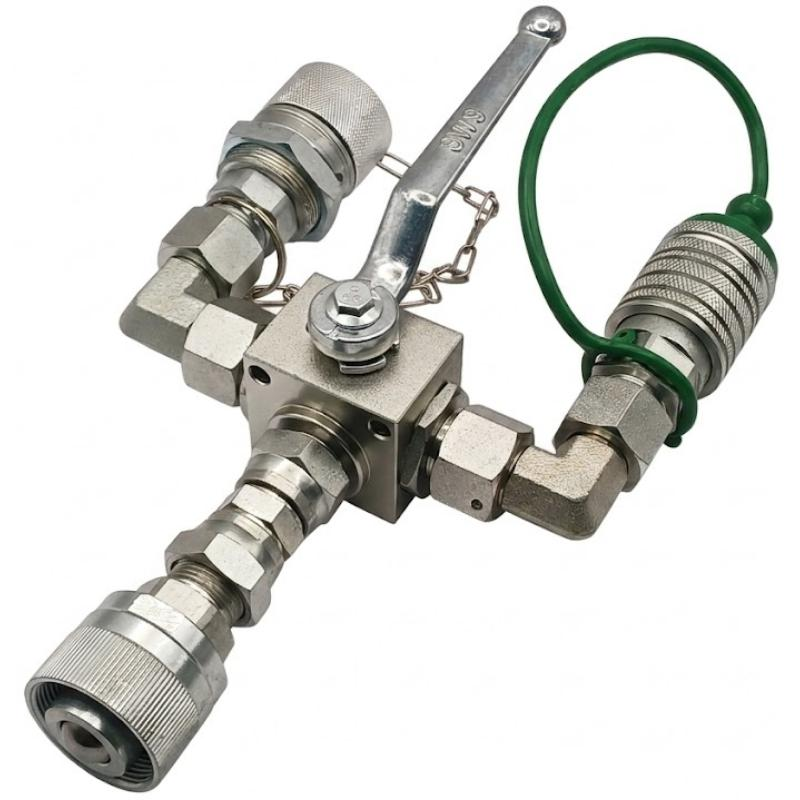 Kompletny rozdzielacz umożliwiający przełączanie pojedynczej linii zasilającej między dwoma liniami wyjściowymi. Komplet z zaworem kulowym i szybkozłączami.