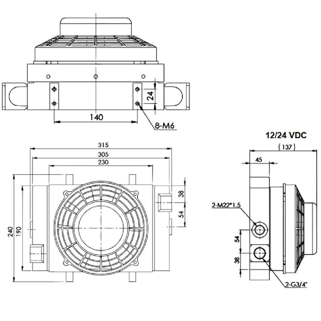 Chłodnica oleju powietrzna, zapewnia idealne chłodzenie oleju w układach hydraulicznych z napięciem na prąd stały 12V. Pojemność 0,48L, max. przepływ 80L/min, średnica wentylatora 190mm, moc 0,100 KW, przepływ powietrza 1300 m3/h.