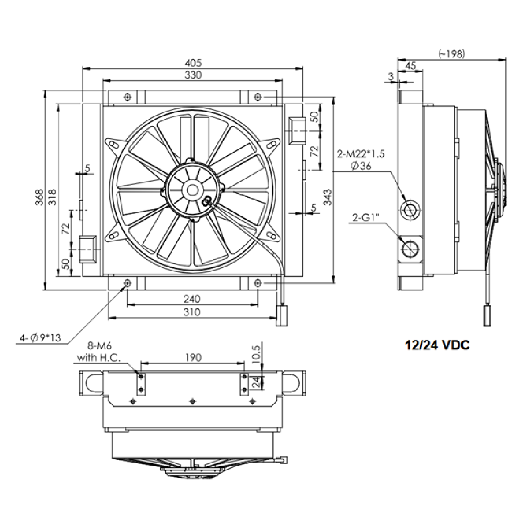 Chłodnica oleju powietrzna, zapewnia idealne chłodzenie oleju w układach hydraulicznych z napięciem na prąd stały 12V. Pojemność 1,5L, max. przepływ 130 L/min, średnica wentylatora 305mm, moc 0,175 KW, przepływ powietrza 2100 m3/h.