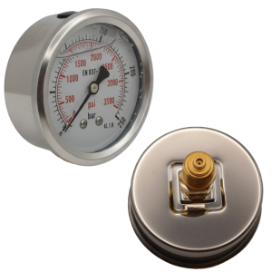 Manometr wewnątrz wypełniony gliceryną dzięki czemu pomiar jest dokładny mimo wstrząsów i wibracji.
