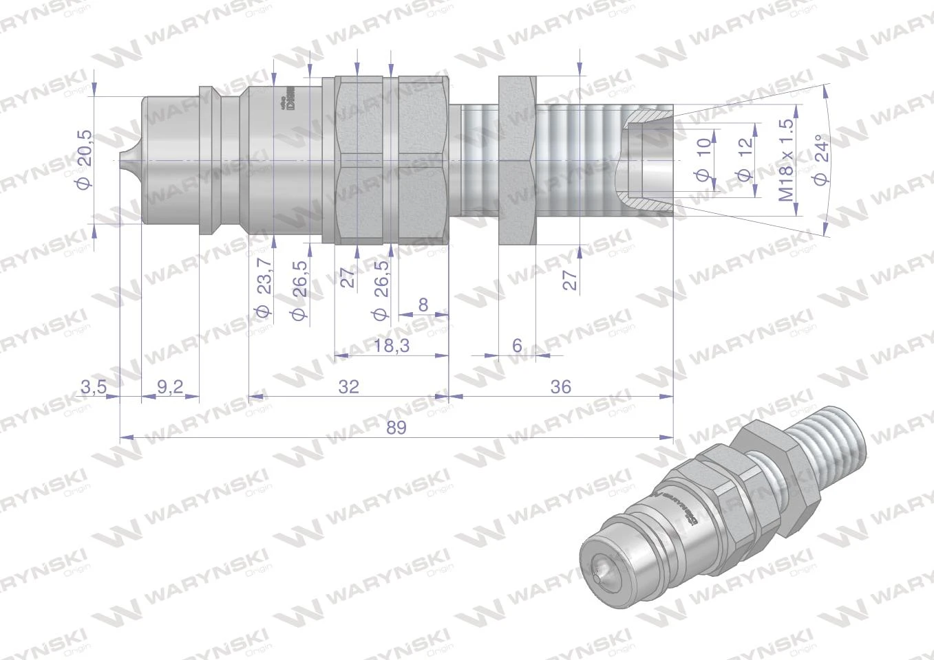 Szybkozłącze hydrauliczne wtyczka euro M18x1.5 gw zew długi WARYŃSKI