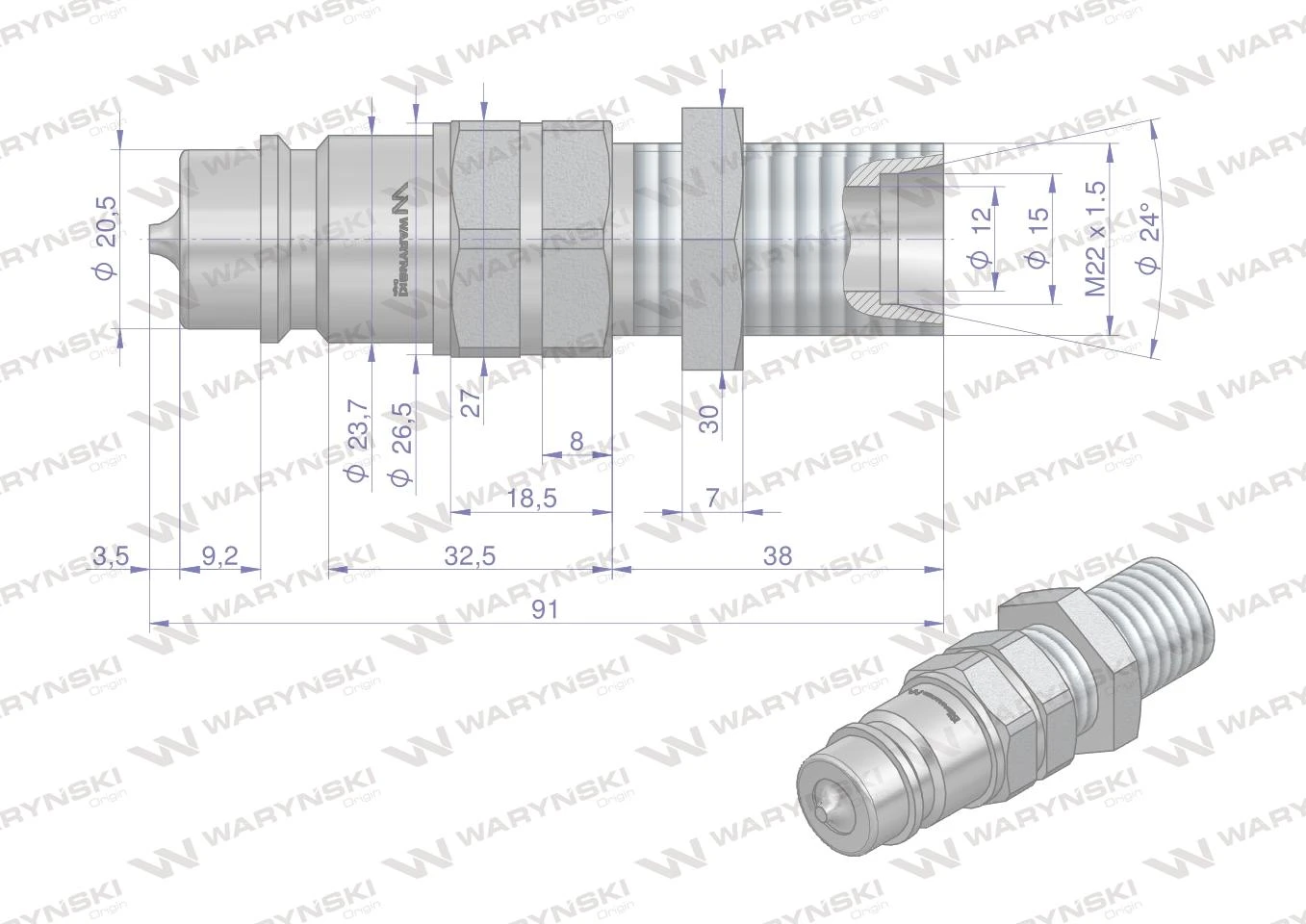 Szybkozłącze euro wtyczka z gwintem zewnętrznym długim z przeciwnakrętką M22x1.5. Pasuje do wszystkich gniazd typu euro. Polska Marka - WARYŃSKI ORIGIN.