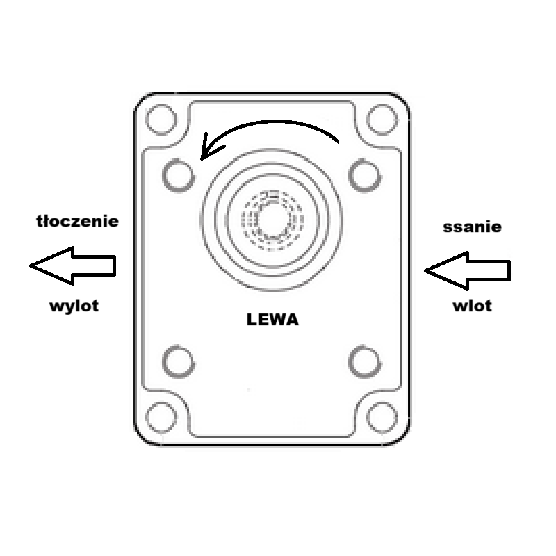 W przypadku lewych obrotów jest odwrotnie: otwór ssący (wlot) jest po prawej, a tłoczny (wylot) po lewej.