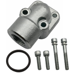 Przyłącze przykręcane do korpusu pompy. Rozstaw otworów montażowych po przekątnej 40mm (sąsiadujących 28mm). Gwint wewnętrzny pod przyłącze 1/2" Pasuje do pomp hydraulicznych z kołnierzem oraz portami na typu niemieckiego.