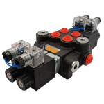 Rozdzielacz hydrauliczny dwusekcyjny o przepływie 40 l/min. Sterowany elektrycznie cewki na 12V.