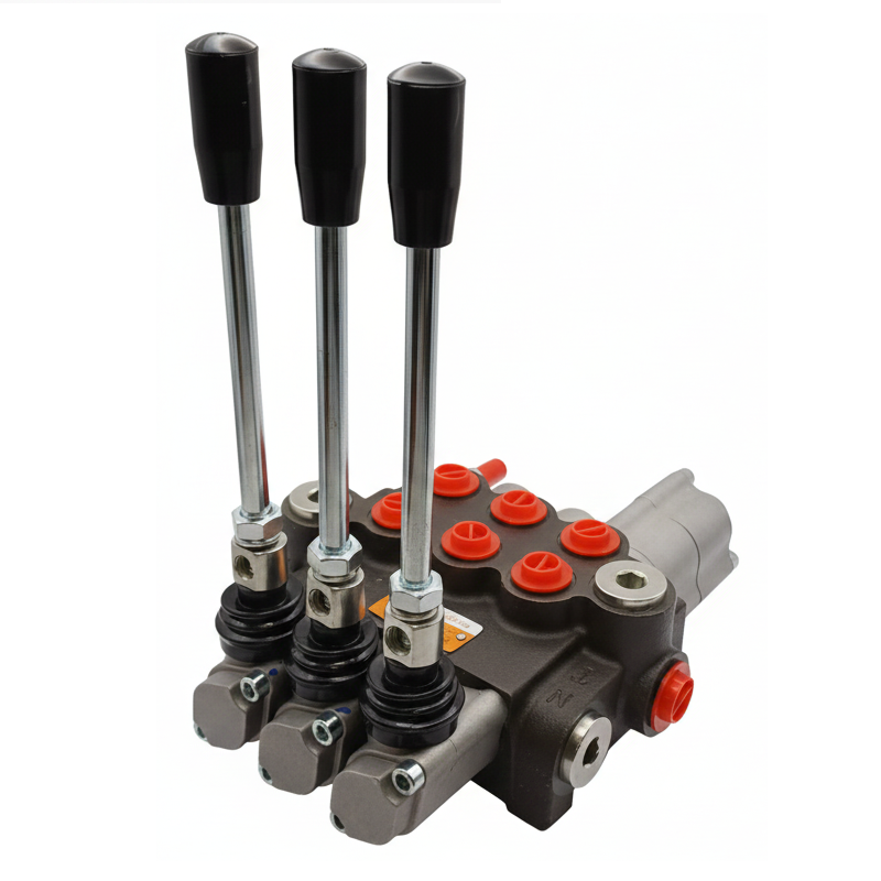 Rozdzielacz hydrauliczny trzysekcyjny o przepływie 40 l/min. Dźwignie na sprężynie, które automatycznie wracają z pozycji roboczej do neutralnej pozycji startowej. 1 dźwignia na sprężynie, czyli sama wraca do pionu + sekcja pływająca na zatrzasku.