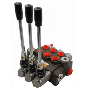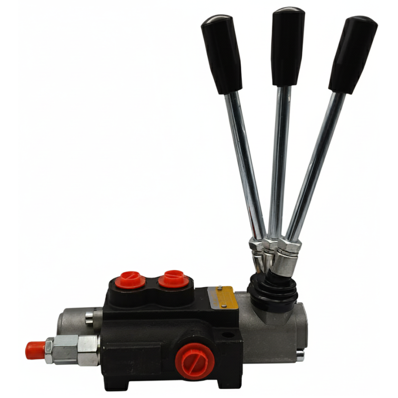 Rozdzielacz hydrauliczny trzysekcyjny o przepływie 40 l/min. Sterowany dźwigniami na sprężynie, które automatycznie wracają z pozycji roboczej do neutralnej pozycji startowej. Dźwignią z zatrzaskiem, czyli sama zostaje w pozycji roboczej.