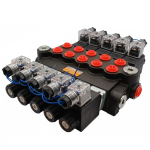 Rozdzielacz hydrauliczny pięciosekcyjny o przepływie 40 l/min. Sterowany elektrycznie cewkami 12V.