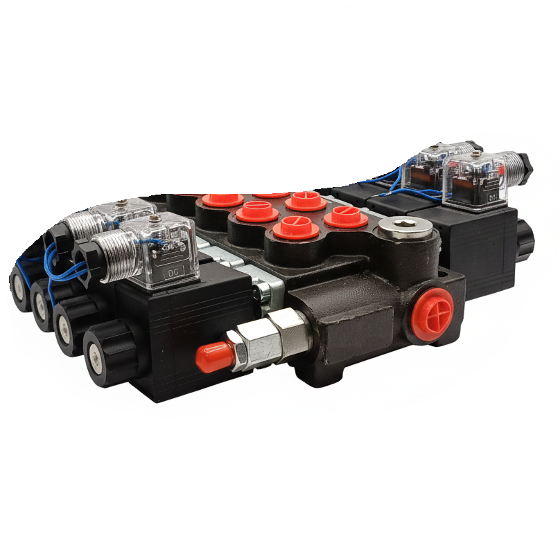 Rozdzielacz hydrauliczny sześciosekcyjny o przepływie 40 l/min. Sterowany elektrycznie cewkami 12V.
