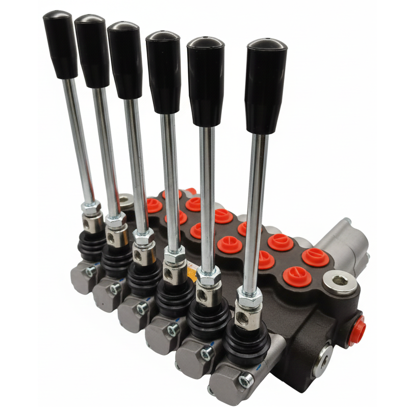 Rozdzielacz hydrauliczny sześciosekcyjny o przepływie 40 l/min. Dźwignie na sprężynie, które automatycznie wracają z pozycji roboczej do neutralnej pozycji startowej. 1 dźwignia na sprężynie, czyli sama wraca do pionu + sekcja pływająca na zatrzasku.