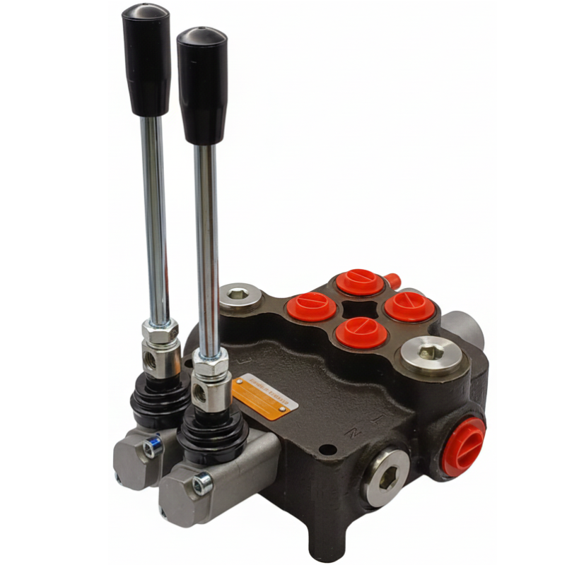 Rozdzielacz hydrauliczny dwusekcyjny o przepływie 80 l/min. Sterowany dźwignią na sprężynie, która automatycznie wraca z pozycji roboczej do neutralnej pozycji startowej. Dźwignią z zatrzaskiem, czyli sama zostaje w pozycji roboczej.