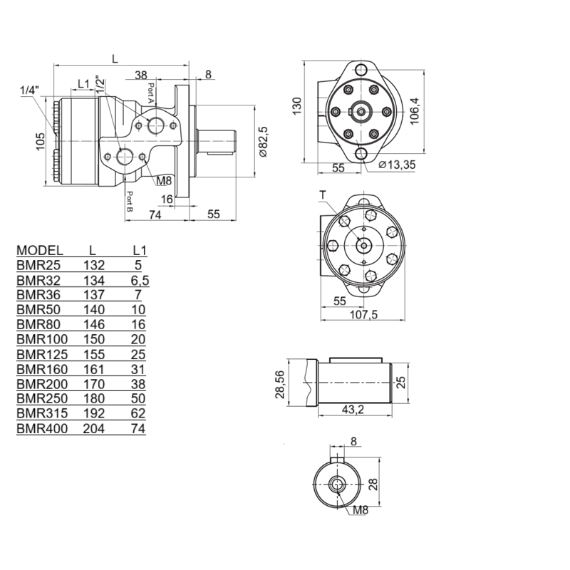 Silnik hydrauliczny BMR OMR SMR OMP chłonność 50cm3/obr, 800 obr/min, wałek-25, U-2 (do pielnika)