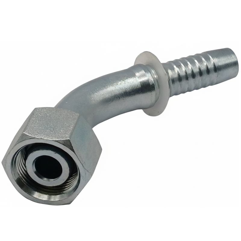 Zakucie kątowe DKOL 45° z gwintem metrycznym. Pasuje do przewodu hydraulicznego DN8 z pojedynczym i podwójnym oplotem oraz do tulejek z grupy DN8.