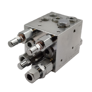 Zawór w pługach obracalnych z liniowaniem. Zapewnia automatyczne przełączenie przepływu oleju, co zapewnia zmianę ruchu siłownika i tym samym liniowanie i ruch obrotowy pługa. Wyposażony w zawory zwrotny. sterowany,