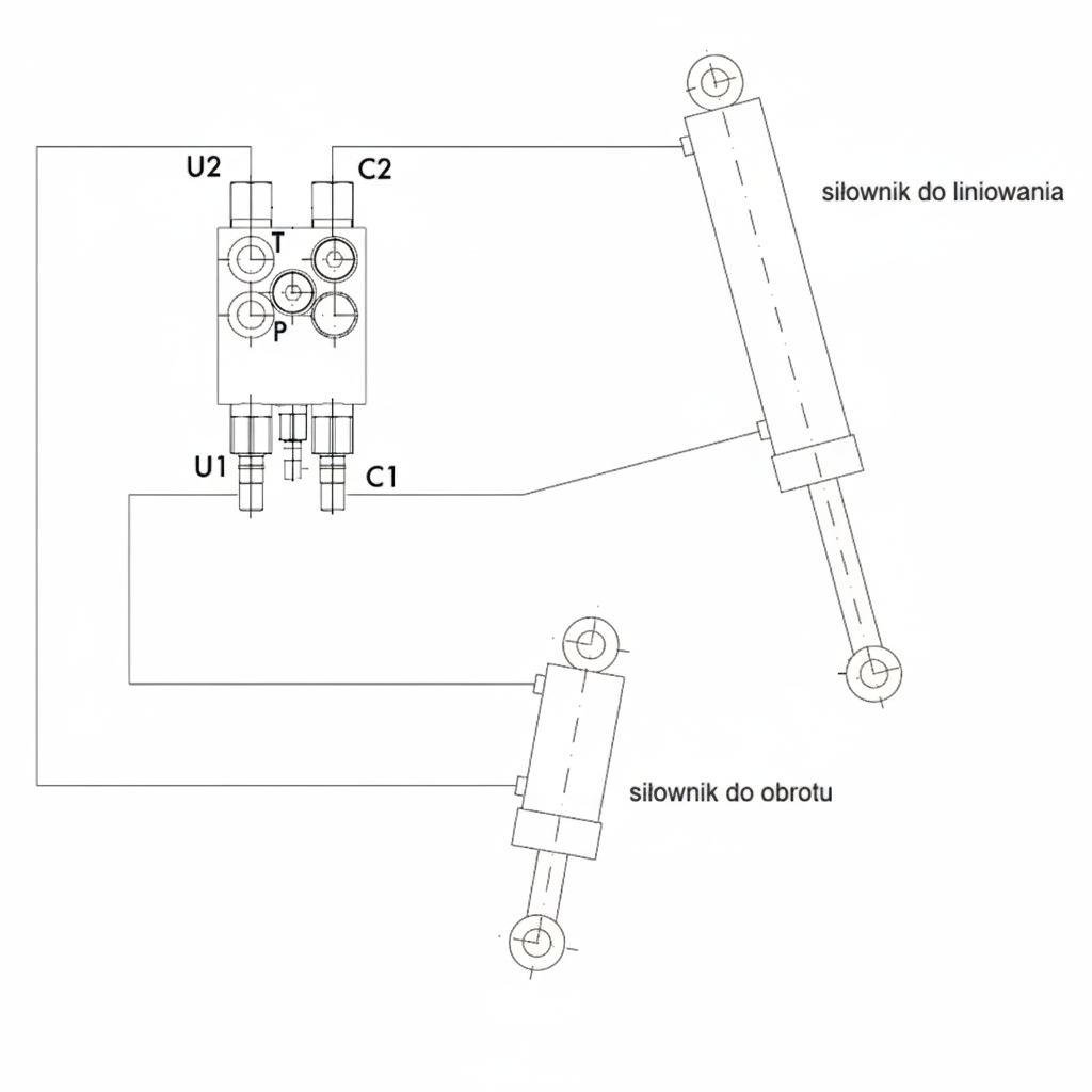 Podłączenie: Przyłącz C1 do tłoczyska siłownika liniowania oraz C2 do tłoka siłownika liniowania.