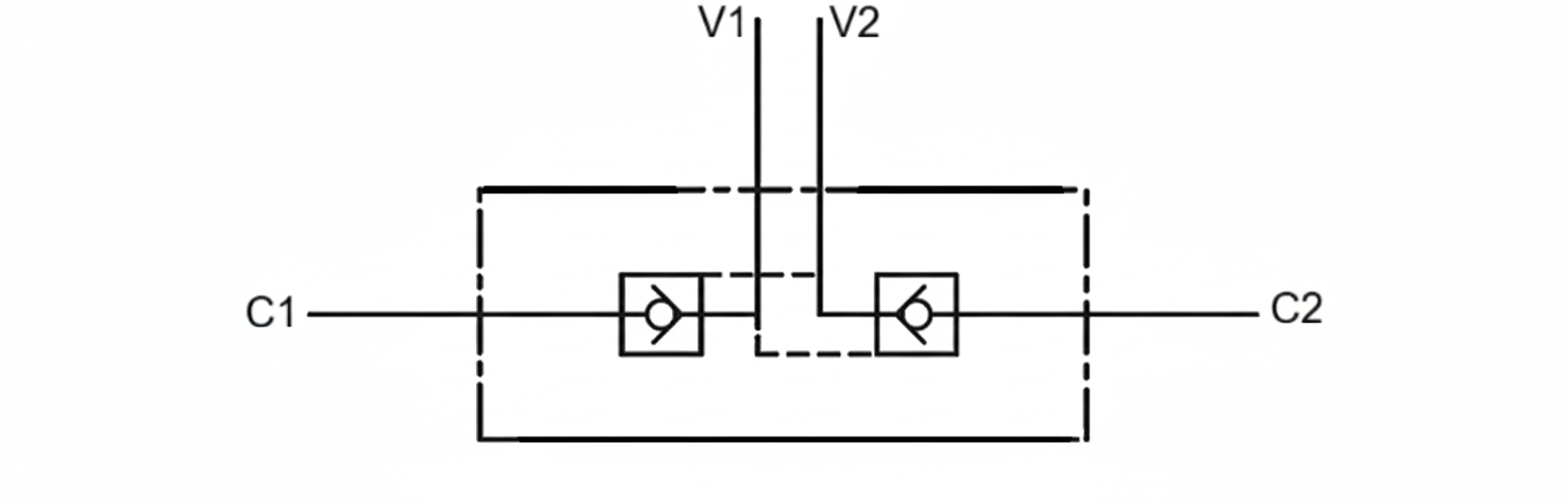 Przepływ z V1 do C1 i z V2 do C2 otwiera się, gdy na V1 lub V2 działa ciśnienie.